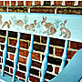 Garderobes, banken, tafels enz. versierd met sjablonen